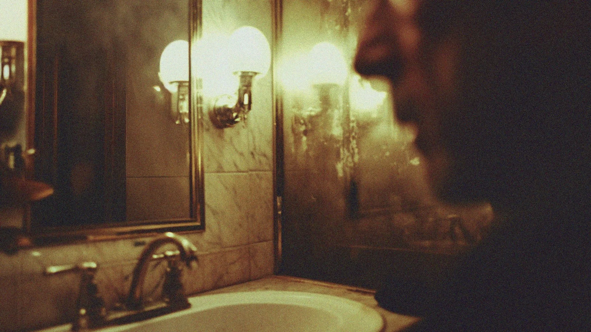 Later, in the bathroom, Leonard and Walter's girlfriend have a brief, empty encounter. Afterward, Leonard studies his reflection in the mirror — a man divided against himself. The title card appears over his face —