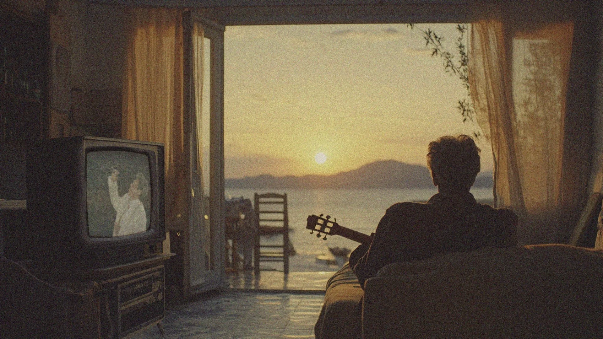 Cut to a small coastal home on the shores of Hydra. An older Leonard, now in his late 70s, reclines on his sofa, a nylon-string guitar resting across his lap. His fingers idly pluck notes as he hums something inaudible to himself. The blue light of a television washes across his face.